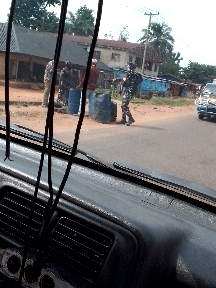 The image, captured from inside a vehicle, depicts a street scene in Unknown, Unknown. The foreground displays a dark gray dashboard with air vents, a partial windshield wiper blade, and several black cables hanging vertically. On a paved asphalt road and adjacent dirt shoulder, five adult males are observed. Three individuals are grouped on the dirt shoulder near two blue industrial barrels: one male wears a light patterned shirt and light trousers, another wears a red long-sleeved shirt and blue jeans while gesturing, and a third is in a dark camouflage uniform. A fourth male, also in a dark camouflage uniform with a backpack, walks away from this central group towards the right side of the frame. On the far right of the paved road, the front section of a light-blue commercial passenger vehicle is partially visible. The background includes various structures: a building with a dark corrugated metal roof and exposed wooden supports, a two-story building with a light-colored facade, and a row of smaller structures featuring blue walls and corrugated roofs. A utility pole with overhead wires, green foliage, and palm trees are present under an overcast sky.