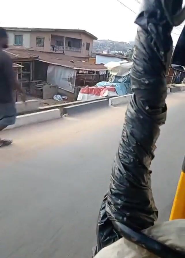 A yellow auto rickshaw is traveling down a street in a developing area. The rickshaw's roll bar is covered in black plastic. Buildings are visible on either side of the road, some covered in tarps. A sign is visible next to a person standing on the side of the road. The road is paved.