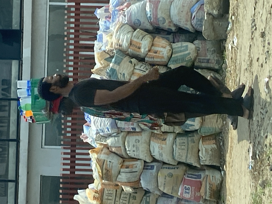 In Moba, Nigeria, a scene depicts two individuals walking from right to left on an unpaved, dusty ground containing sparse debris. The foreground features a male subject in profile, facing left, with a dark beard and short dark hair. He wears a black short-sleeved t-shirt, dark trousers, and dark sandals, exhibiting a muscular right arm. Behind and slightly to the left of the male, another individual, partially obscured, carries a green plastic crate on their head. The crate contains multiple plastic bottles, some filled with colored liquids (red, orange, green) and others clear. This individual wears a colorful, patterned garment. In the background, a substantial quantity of large, light-colored sacks are stacked in multiple rows, forming a significant barrier. Labels on some sacks include "DANGOTE" and "CEMENT," indicating their contents. Behind these sacks and the individuals, a reddish-brown slatted fence is visible. Beyond the fence, a light-colored building with large, dark-tinted windows is present. The overall environment suggests an outdoor commercial or storage area.