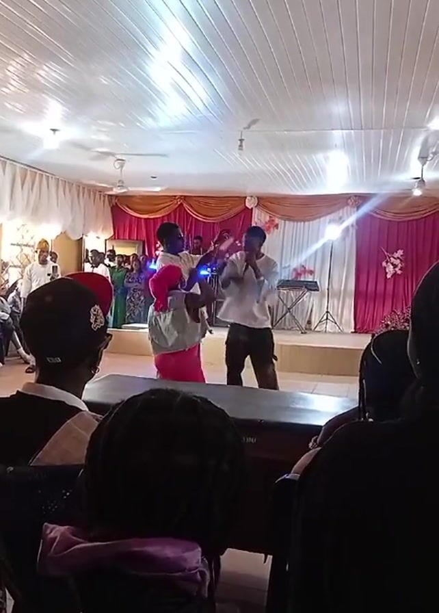 performance taking place on a stage in a large indoor space, likely a hall. A man in a white shirt and dark pants is singing into a microphone and dancing. He's accompanied by a woman wearing a pink outfit who is also dancing. A band is visible in the background on the stage. The stage is decorated with gold and pink curtains, and there are some decorations like balloons. The audience is seated in front of the stage. Several people are visible in the foreground, mostly seen from the back. The lighting is bright, and some light flares are visible from the stage lighting. There are ceiling fans and fluorescent lighting on the ceiling of the hall.