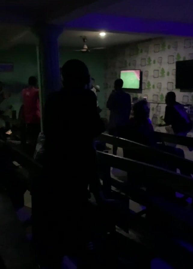 group of people in a dimly lit room, possibly a bar or a gathering place. Most of the people are silhouetted against the light. They are standing, sitting on benches, and reacting to something happening, likely on the television screen. There are two television screens on the wall, and a ceiling fan is rotating. The walls are painted in green tones, and the room has a blue lighting effect. The people seem excited, with one individual raising their arms in the air.