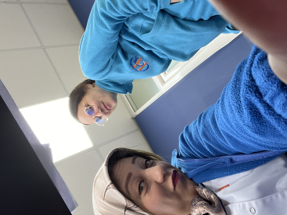 A low-angle indoor photograph features two adult females. In the foreground on the left, one woman with dark hair and a light-colored headscarf wears a white collared shirt beneath a blue fleece jacket. She has dark eyebrows, dark lipstick, and looks towards the camera with a slight pout; her hand is partially visible in the bottom right corner, suggesting she is holding the camera. In the background on the right, the second woman, with dark hair, wears light-rimmed glasses and a bright blue fleece jacket featuring an orange and blue embroidered circular logo on the left chest, which appears to be a stylized number '6'. She smiles faintly and has her right hand in a jacket pocket. The environment consists of dark blue walls, a white window or door frame on the right, and a dropped ceiling with white grid panels and rectangular overhead lighting fixtures. The specific location within Meknes, Morocco, is not discernible from the image.