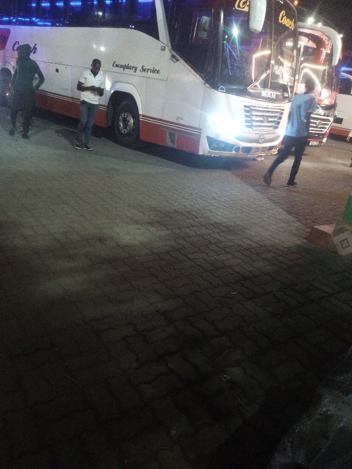 The scene depicts a paved bus terminal or rest stop in Mtito Andei, Kenya, at night
