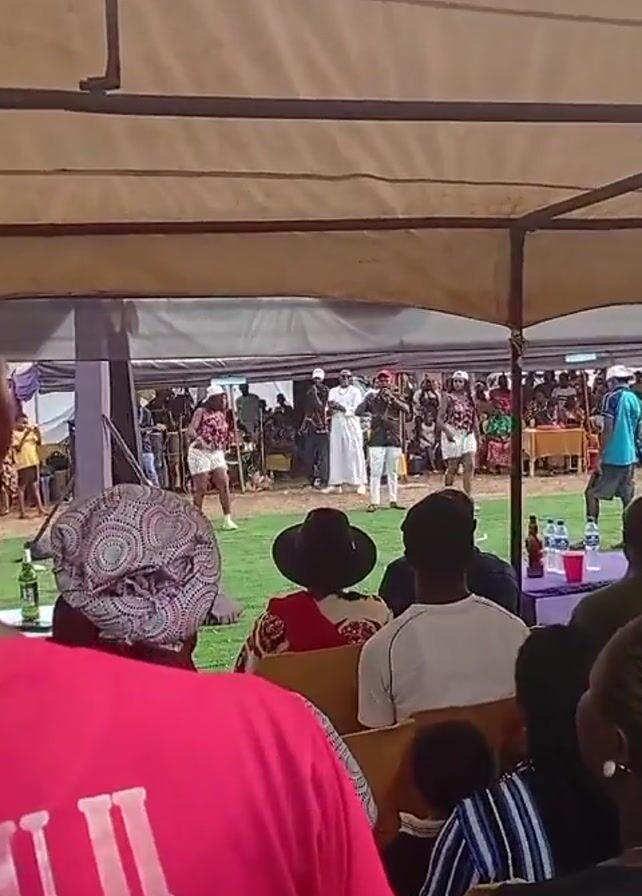 The video captures a lively outdoor event, likely a celebration, taking place under a large white tent. A crowd of people, some seated and some standing, are watching a performance on a stage covered with artificial green turf. On stage, a band is playing music, and a lead singer in a colorful shirt and red cap is performing with two female dancers dressed in matching tops and white shorts. The dancers are actively moving and engaging with the music. The audience appears relaxed and enjoying the performance. Bottles of drinks are visible on tables among the audience. The atmosphere seems festive and celebratory.