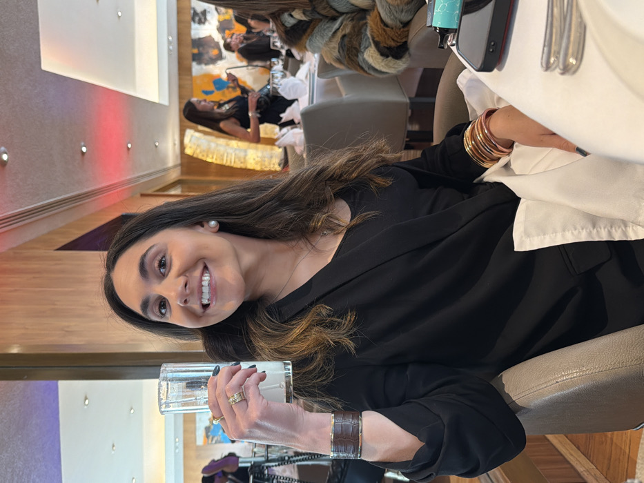 A smiling woman, seated at a restaurant, holds a glass. She has long brown hair and wears a black top, a pearl earring, and jewelry on her wrists and fingers. The restaurant has modern decor with a large abstract painting and a light fixture visible in the background. Other patrons are seated at nearby tables. A white napkin, phone, and silverware are on the table next to her.
