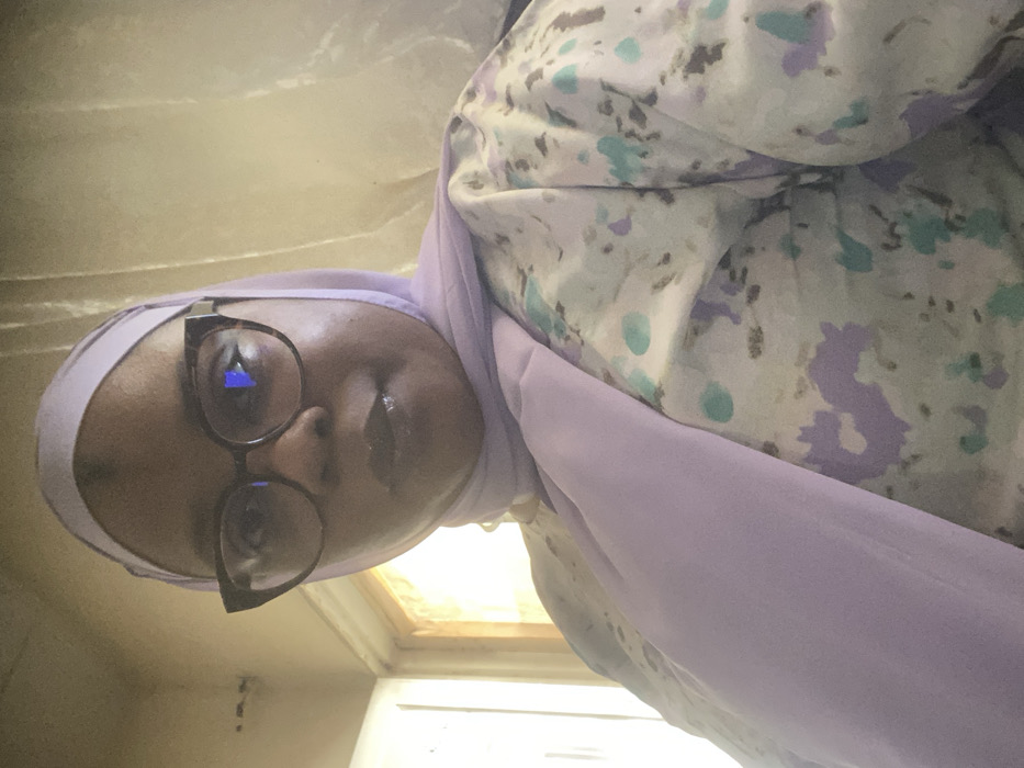 A female subject is depicted from the upper torso up, facing the camera directly in an indoor setting in Hotoro South, Nigeria. She wears a light purple hijab covering her head and chest, and a patterned garment featuring light purple and teal abstract designs. Dark-framed, cat-eye style eyeglasses with reflective lenses are worn, obscuring her eyes. Her lips are visible and appear glossy. The immediate background on the left includes a light-colored window frame with visible light filtering in, while the right side features a light-colored, possibly textured wall. No other individuals or significant objects are discernible. The subject is stationary, looking directly forward.