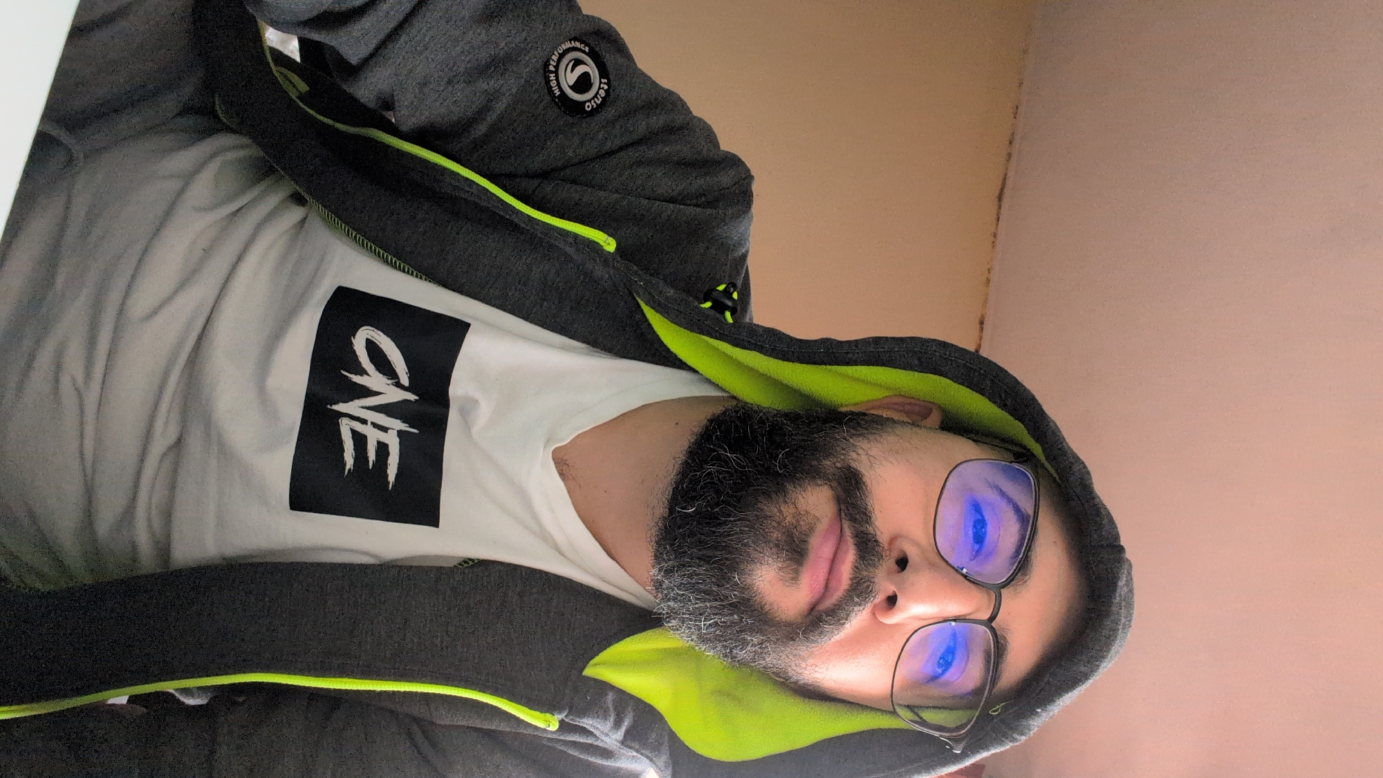 The image depicts a male individual, captured from a low angle in a chest-up portrait. The subject has a full dark beard and mustache and is wearing black-framed eyeglasses with visible blue light reflections on the lenses. He is dressed in a dark gray hooded sweatshirt featuring a neon yellow-green interior hood lining and matching zipper accents. A circular patch on the left sleeve of the sweatshirt displays the word "stenso" and "HIGH PERFORMANCE." Beneath the sweatshirt, he wears a white t-shirt with a prominent black rectangular graphic on the chest containing the white, stylized word "ONE." The individual maintains a direct gaze towards the camera with a neutral expression. The background reveals an indoor setting with a light beige ceiling and a solid beige wall. A dark, discolored line, consistent with mold or dirt accumulation, is visible along the seam where the ceiling meets the wall in the upper left quadrant of the frame. The precise location within the city of Oreshak, Bulgaria, cannot be determined from the visual evidence presented in the image.