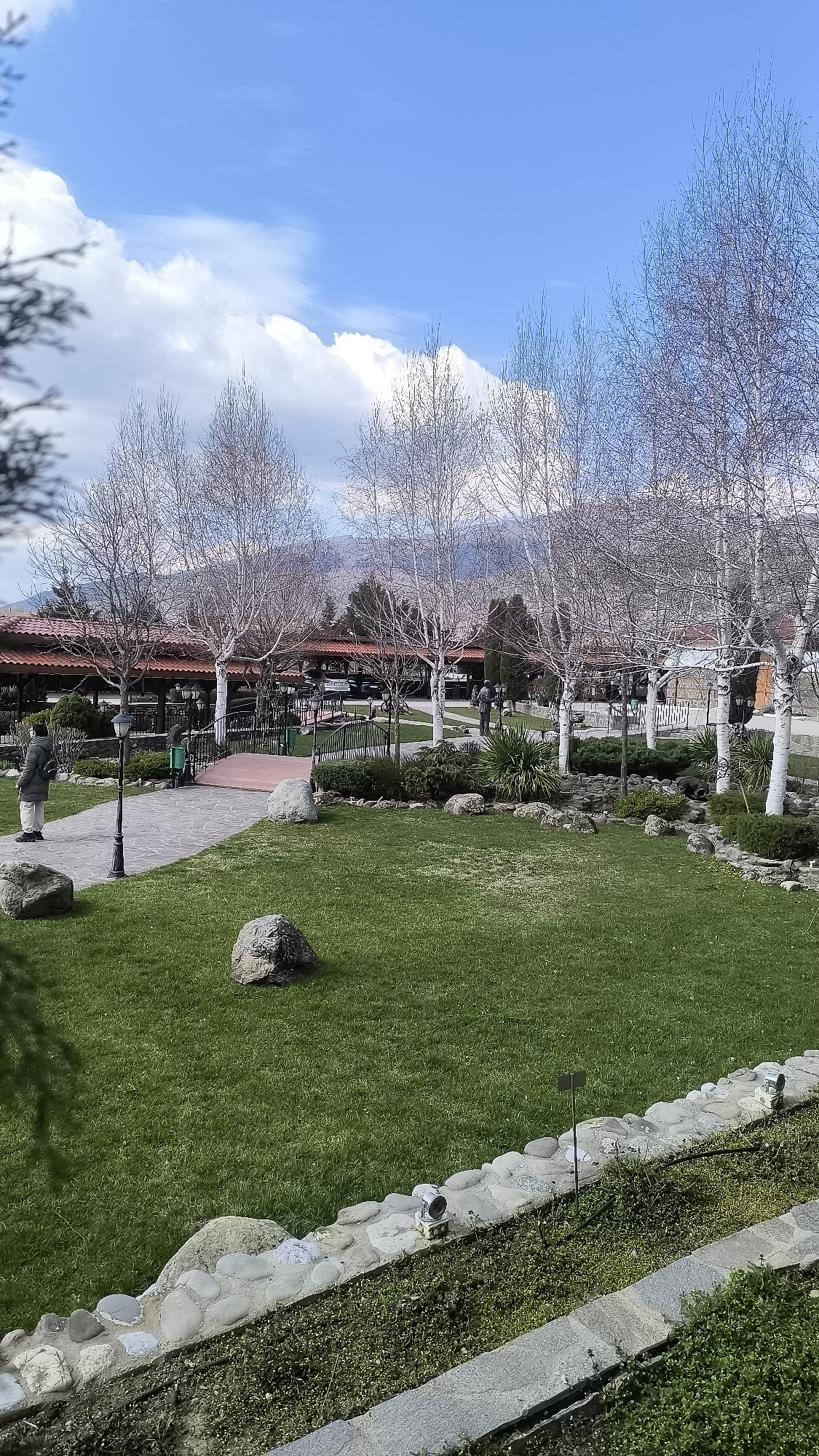The image displays an outdoor area of what appears to be a commercial establishment, likely a restaurant or resort complex, situated in Skobelevo, Bulgaria. The sky is bright blue with scattered white cumulus clouds, and hazy, distant mountains are visible along the horizon. In the foreground, a low, horizontal stone retaining wall is present, upon which two silver, cylindrical spotlights are mounted. To the left of this wall, a patch of green grass is visible. A wide, light-colored paved pathway, constructed from flagstones, curves from the left side of the frame towards the mid-ground. Adjacent to this path on the left stands a black streetlamp with a single fixture. The central and right foreground is dominated by a neatly mown green lawn, featuring two large, irregularly shaped rocks. In the mid-ground, a single individual, dressed in a light-colored jacket and dark trousers, and carrying a backpack, stands on the paved path, facing away from the camera towards the complex's structures. A small pedestrian bridge with black metal railings and a reddish-brown deck spans a landscaped area, connecting sections of the paved pathways. Beyond the pathways and lawn, several low-slung buildings with reddish-brown tiled roofs and exposed wooden support structures are visible, characteristic of a restaurant or hospitality complex. Numerous deciduous trees, largely bare of leaves and possessing light-colored bark, are dispersed throughout the scene, particularly along the pathways and around the buildings. Evergreen shrubs and bushes contribute to the landscaping. Multiple indistinct figures are present on the paved areas near the buildings in the background. The scene suggests a clear day during a season when deciduous trees are dormant but ground cover is green.