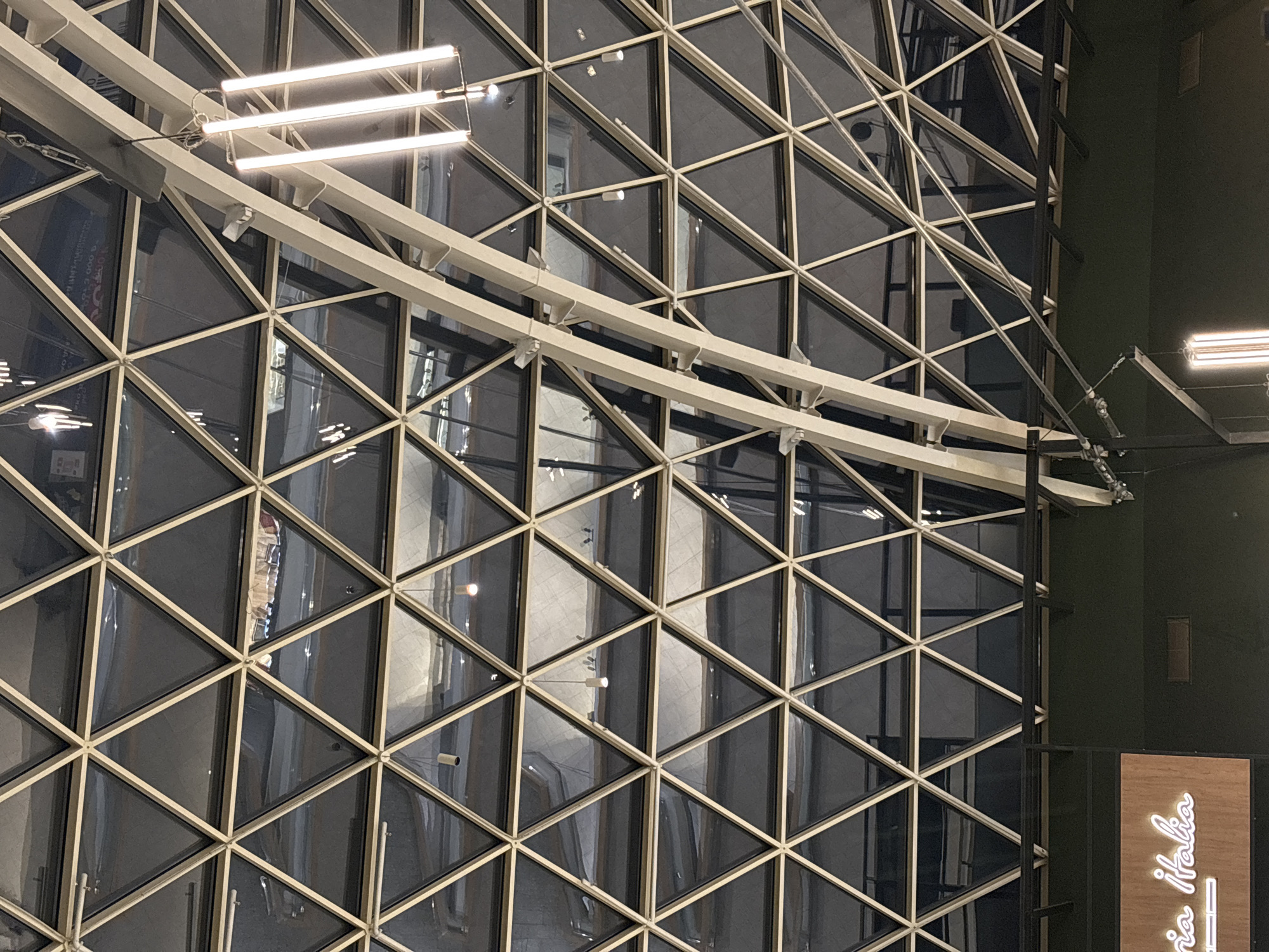 A geometrically constructed glass ceiling, composed of numerous triangular panes with metal framing, dominates the frame