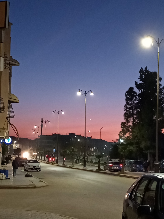 A twilight streetscape features a long road stretching into the distance. Streetlights line the road, illuminating the scene. Cars are parked along the side and driving along the road. A building is on the left and trees are on the right. The sky transitions from a dark blue to a red-orange horizon. The scene is peaceful and quiet.