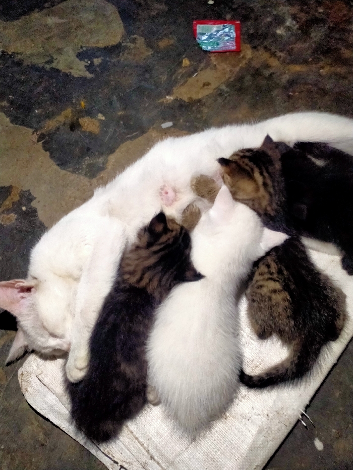 A white cat lies on a white mat, surrounded by its kittens. There are three tabby kittens and one white kitten nursing. The cat's eyes are closed and she appears to be resting. A red and silver foil packet lies on the ground nearby. The surface under the mat is a mottled gray and brown.