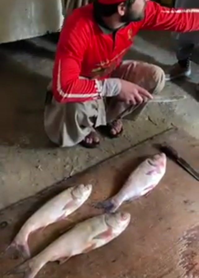 A man wearing a red shirt and cap is squatting on the floor next to a wooden table. There are three fish laid out on the table. The man is holding a knife and appears to be preparing the fish. Two other people can be seen in the background. The floor is concrete.