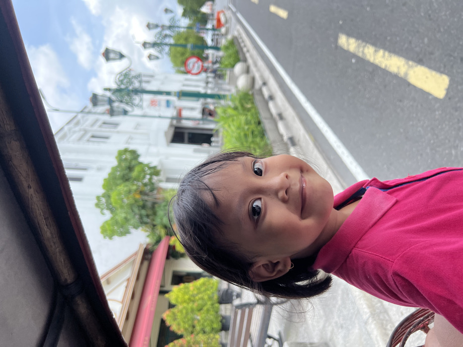 A young child with dark hair and eyes, wearing a bright pink polo shirt, smiles at the camera. The background is a street scene with a white building, trees, and vintage-style street lamps. A road with yellow stripes runs along the right edge of the frame. The child is likely in a vehicle, judging by the blurry metal structure visible on the left. The photo is taken at an angle, giving a slightly disoriented perspective.