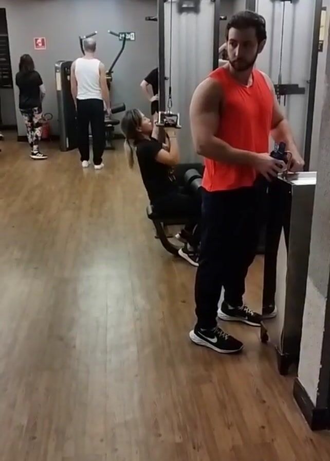 interior of a gym with multiple individuals engaged in exercise activities. A woman in a black t-shirt and leggings is seated on a weight machine and performs a lat pulldown exercise. A man in an orange tank top and dark pants stands near her, holding a water bottle and looking in her direction. Another man in a white tank top and black pants is further away, using a different machine. Additionally, a woman in patterned leggings and a black top is standing near the wall. The gym has a wooden floor and the lighting is bright.