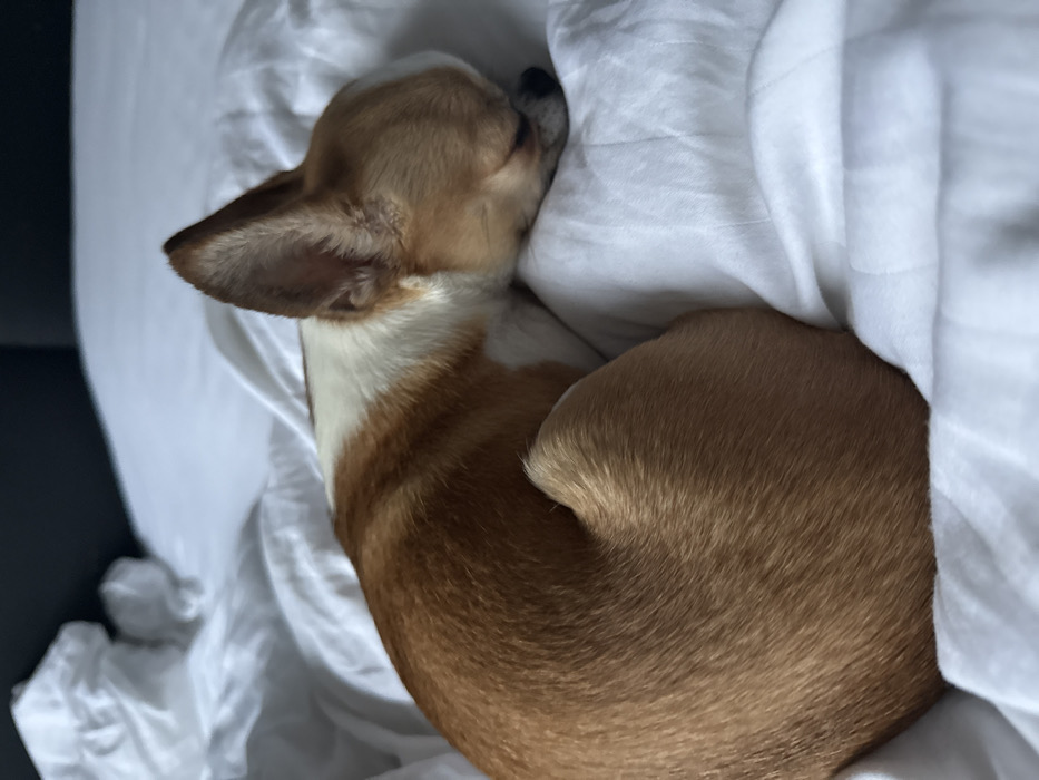 - "A small, tan and white chihuahua curls up and sleeps on a white bed" by FM-eQUGe2, licensed under CC BY 4.0