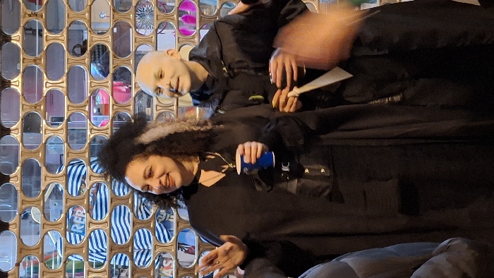 Two people wearing dark clothing stand in front of a mirrored wall. The person on the left has curly hair and is holding a blue cup. The person on the right has a shaved head and is holding a white paper. They both appear to be smiling. The background shows reflections of various items and patterns.
