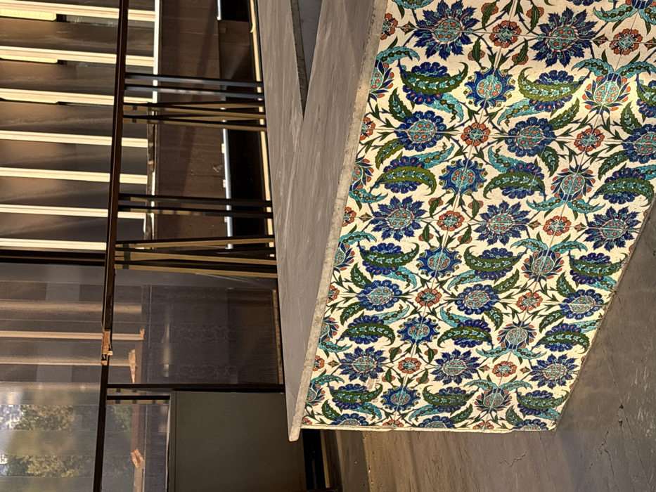 The image depicts a static outdoor scene within Al-Muhajerin Municipality, Syria, captured during daylight. In the foreground, a prominent rectangular structure, possibly a counter or planter, occupies the lower half of the frame. Its vertical face is clad in ornate ceramic tiles featuring a repeating floral pattern in shades of dark blue, light blue, teal, and green, accented with subtle reddish-orange elements, all against an off-white background. The top surface of this structure is a flat, light grey material, likely concrete or stone. The ground in the immediate foreground is also a light grey, flat surface. In the midground, behind the tiled structure, a dark-colored metal railing or barrier runs horizontally across the scene, supported by vertical posts. Beyond this railing, a larger structure with vertical opaque or translucent panels, possibly glass or plastic sheeting, is visible within a dark frame. Sunlight reflects off these panels, creating vertical highlights. Further in the background, through the translucent panels and above the railing, blurred green foliage and indistinct architectural elements suggest an urban or suburban outdoor environment. No individuals or specific actions are depicted.