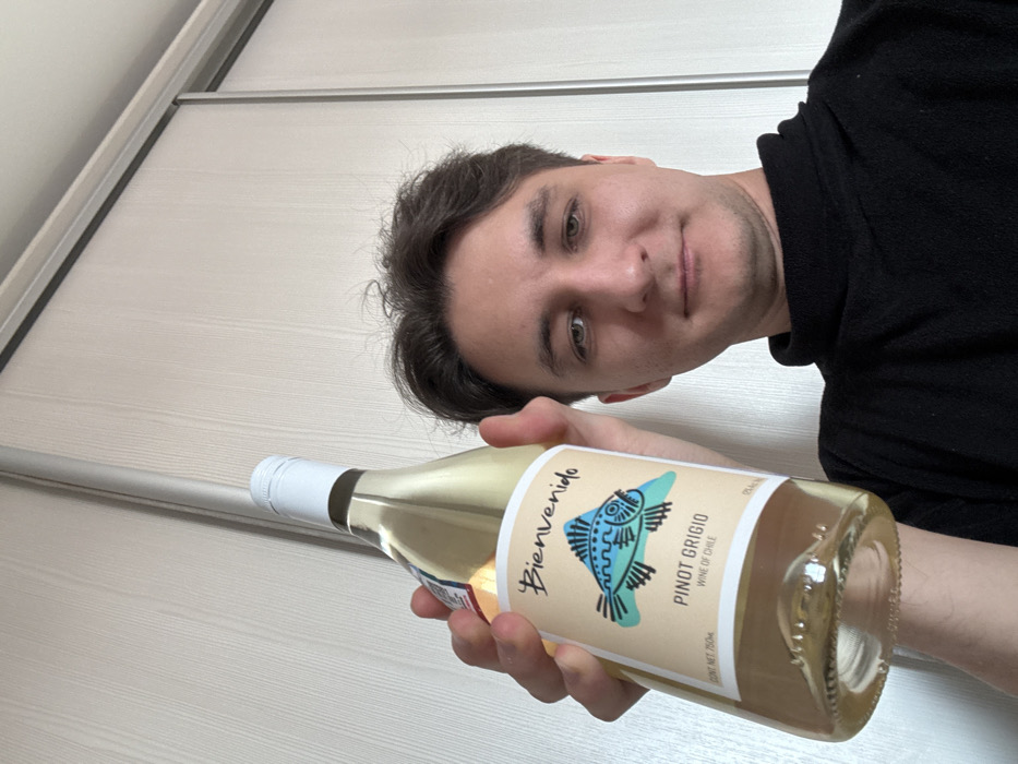 A young adult male is depicted in a close-up indoor shot, originating from Kazan, Russia. He is positioned slightly off-center to the right, facing forward with a neutral expression and a slight smile. He has short, dark, wavy hair and light-colored eyes, and wears a black turtleneck shirt. The subject holds a clear glass bottle of white wine in his left hand, extending it towards the camera. The bottle's label, beige, displays the word "Bienvenido" in script, followed by a stylized blue and teal fish illustration. Below this, the text "PINOT GRIGIO" and "WINE OF CHILE" are visible, along with "CONT. NET 750ml". The bottle is sealed with a white screw cap. The background consists of a light-colored wall with subtle horizontal lines, and a portion of a light-colored vertical panel or door with a darker vertical track is visible on the right side of the frame.