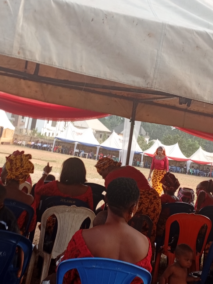 The scene depicts an outdoor event taking place in Nkwelle, Nigeria, viewed from beneath a large white canopy tent