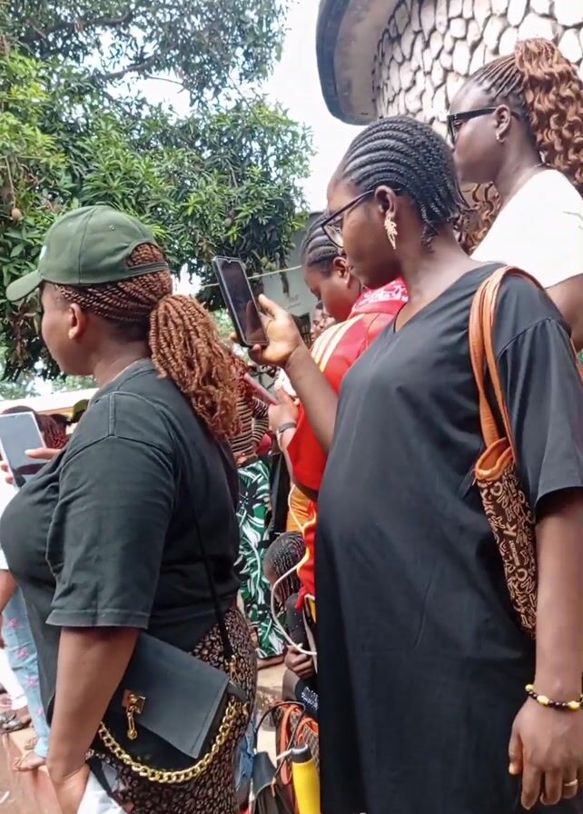 group of people, primarily women, watching a performance or ritual taking place in a courtyard