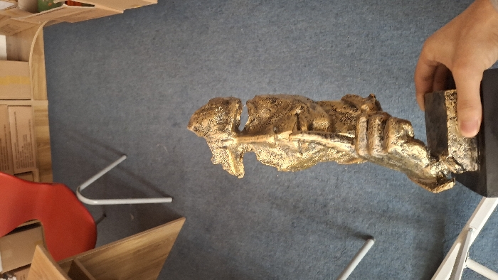 An indoor scene in Tashkent, Uzbekistan, captured from a slightly elevated perspective. In the immediate foreground, a light-skinned human hand holds the black rectangular base of a gold-colored abstract sculpture, approximately 30-40 cm in height. The sculpture depicts a stylized, textured face with an elongated form and a finger pressed to its lips, signifying silence. The floor is covered in a dark grey, mottled carpet. To the left, a section of a light-colored wooden table is visible, beside which stands a red, modern-style chair with curved silver-colored metal legs. The background reveals a segment of light-colored wooden flooring at the base of a wall, against which multiple brown cardboard boxes are stacked. One box exhibits a vertical yellow stripe. The scene is uniformly lit.