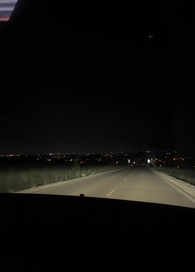 The video depicts a nighttime view from inside a car driving on a dark road. The car's headlights illuminate the road ahead. In the distance, a city skyline is visible, marked by numerous scattered lights. The surroundings appear to be fields or open areas. The video is taken from the driver's perspective, with the car's dashboard visible at the bottom. The video's view is largely static, with the primary focus on the road and distant city lights.