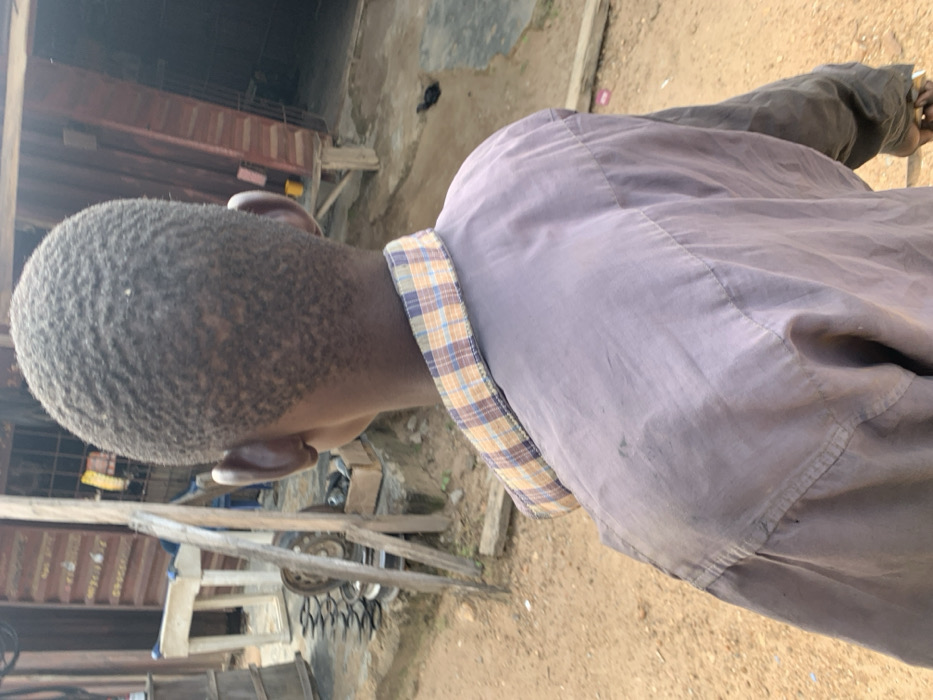 An individual, likely a young male, with dark skin and short, tightly textured dark hair, is depicted from behind, occupying the central foreground of the image. The person is wearing a faded purplish-mauve long-sleeved shirt with a plaid collar featuring a pattern of yellow, orange, blue, and white squares. The sleeves of the shirt are a darker, possibly grey or brown, hue, contrasting with the main body. The scene is an outdoor, unpaved area. The ground is composed of reddish-brown dirt. In the midground and background, multiple structures are visible, appearing to be constructed from corrugated reddish-brown metal sheets, suggesting informal shops or dwellings. To the left, a light-colored wooden or metal frame structure serves as a makeshift shelf or workbench, holding objects resembling a large metal spring and a wheel rim. Wooden planks are leaning against structures. In the background to the right, near a corrugated metal structure, a dark, bird-like object is visible on the ground. The environment suggests an informal commercial or residential district within an unspecified city.
