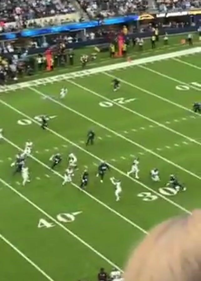 From an elevated perspective at a stadium, an American football game unfolds on a green field with white markings. Numerous players in dark and white uniforms engage in a play. Spectators populate the stands in the background. In the foreground, fans in Detroit Lions apparel cheer the play. The camera shifts abruptly downwards, obscuring the view.
