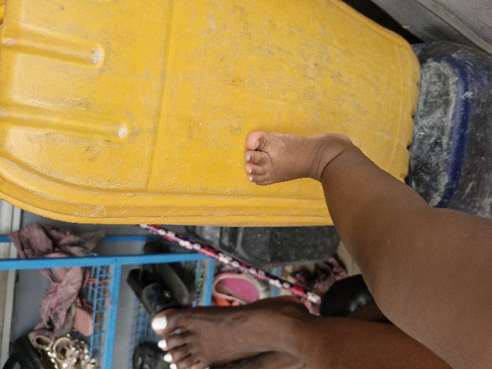The scene depicts a partial view of an indoor or semi-enclosed domestic environment in Ado, Nigeria. In the foreground, two human limbs are visible: an adult's left lower leg and foot, exhibiting dark skin and white-painted toenails, rests on the upper left. Adjacent, a baby's right leg and foot, also with dark skin, is extended towards a large, yellow, rectangular plastic container, which dominates the right side of the frame. This container appears worn with scratches and rests on a blue object, possibly another container. In the background, to the left of the yellow container, a blue metal shelving unit with at least two visible shelves is present. The upper shelf holds light-colored, possibly metallic decorative items and crumpled pink fabric. The lower shelf contains multiple dark-colored shoes or sandals, along with one pink shoe. A vertically oriented, multi-colored striped object is partially visible between the shelving unit and the yellow container.