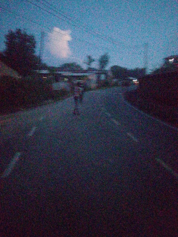A grainy, low-light image of a road stretching into the distance. Trees and indistinct buildings line either side. A lone figure stands in the middle of the road. The sky is a dark blue, with a pale cloud visible in the upper left. There are lane markings visible on the road. Car headlights are barely discernible further up the street.