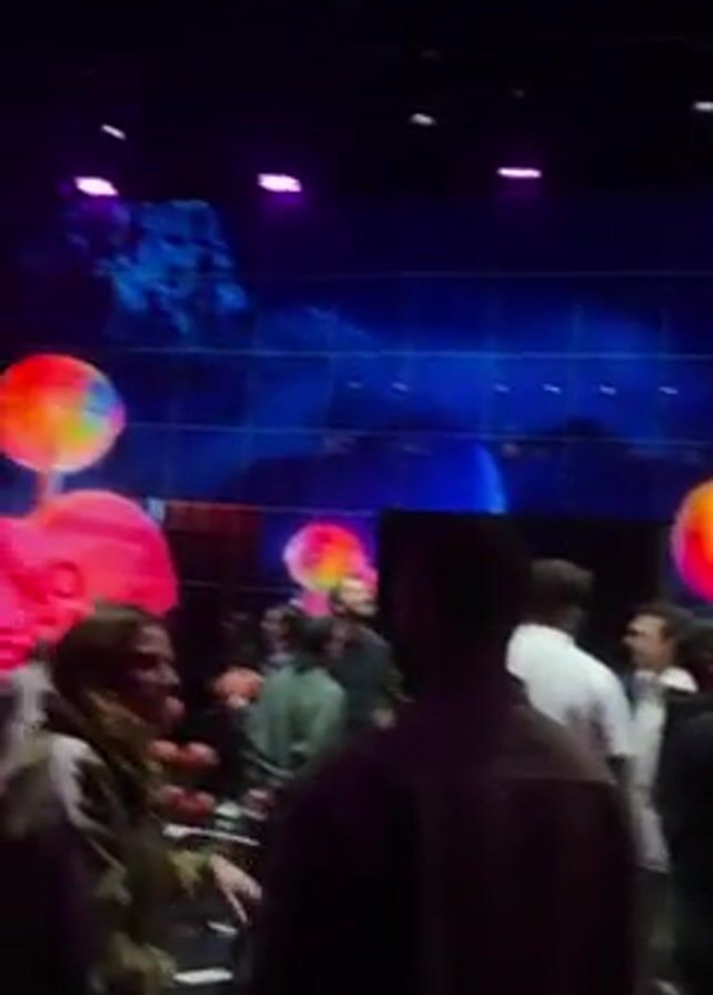people on a basketball court with a colorful backdrop featuring images of lollipops, clouds, and text saying "NO ESCAPE." One person wearing a red jacket shoots a basketball. There are multiple basketballs on the court. The lighting in the room is a mix of purple, blue, and white.