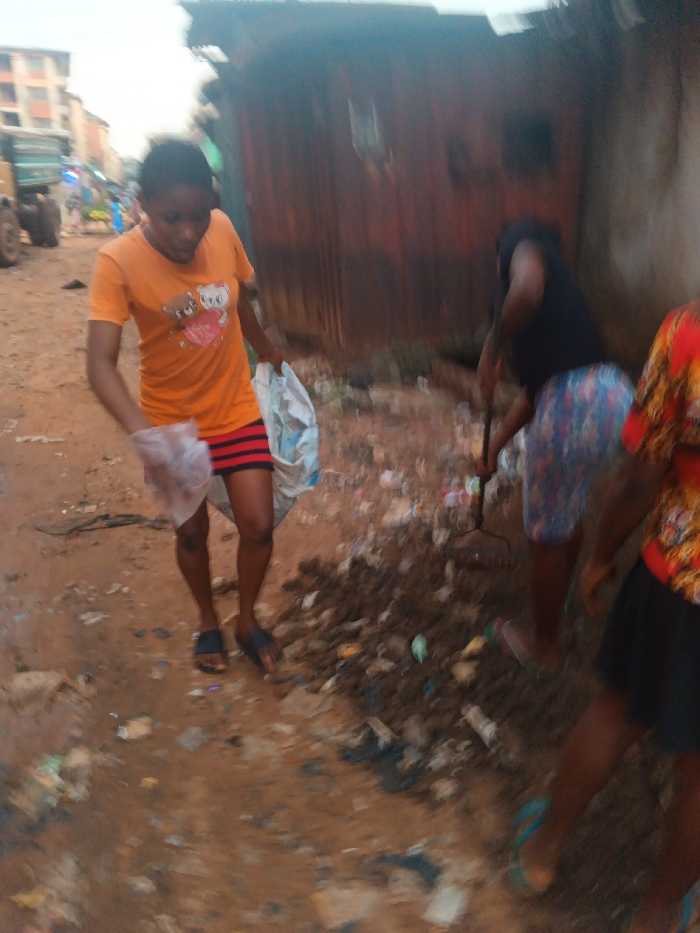 - "The image depicts three individuals engaged in a clean-up activity on an unpaved, reddish-brown dirt street in Onitsha, Nigeria" by FM-mFVo23, licensed under CC BY 4.0