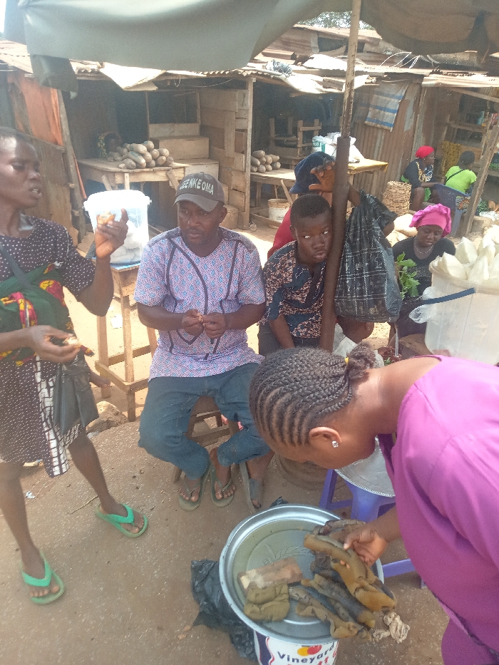 The image depicts an outdoor market scene in Nsugbe, Nigeria, under bright daylight