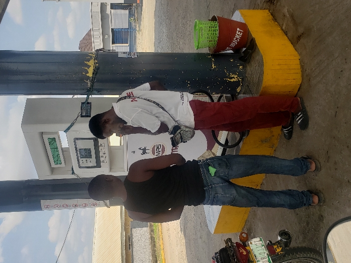The image displays a daylight scene at a fuel station in Zango-ndaji, Nigeria