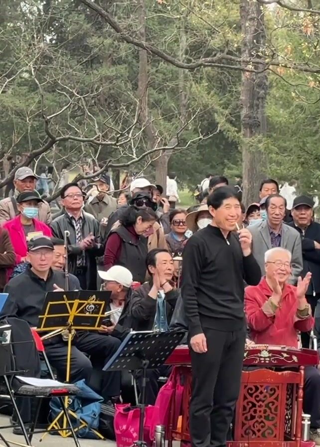 A crowd of approximately 50 people is gathered in a wooded area, likely a park. The majority of the attendees appear to be older adults. Many are wearing hats and some are wearing face masks. In front of the crowd, a group of about 10 musicians are seated, playing various Chinese instruments, including a pipa, a dulcimer, and what appears to be a bowed string instrument. A man in a black shirt is standing in front of the musicians, apparently conducting or singing. After what seems to be the end of a song, the crowd applauds and the conductor bows in response. Some people in the crowd are taking photos or videos with their phones. The scene suggests a community event or a casual outdoor performance of traditional Chinese music.