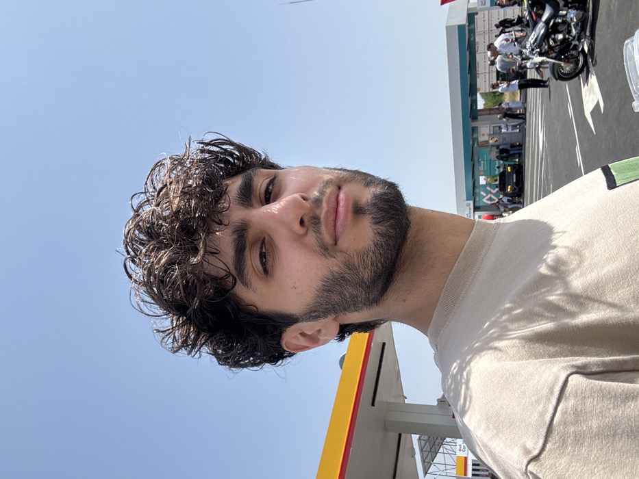 A young man with curly, slightly wet hair and a beard poses against a backdrop of a clear blue sky and a Shell gas station. He is wearing a beige t-shirt. Behind him, blurred images suggest a crowd and motorcycles parked near a building with a red and white flag. The photo appears to be taken at a low angle, emphasizing the man's face and the expansive sky.