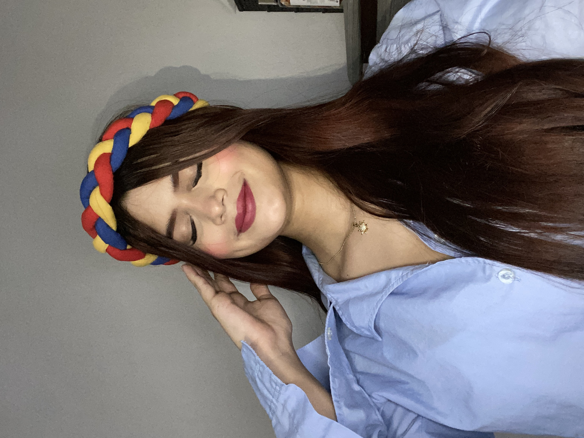 A woman with long, brown hair is posed indoors. She is wearing a blue button-down shirt and a headband with red, yellow, and blue braided fabric. She is wearing makeup, including blush and lipstick. Her eyes are closed and she is smiling slightly. Her hand is near her face. She also has a gold necklace. The background is a plain grey wall. The location is not discernible from the image.