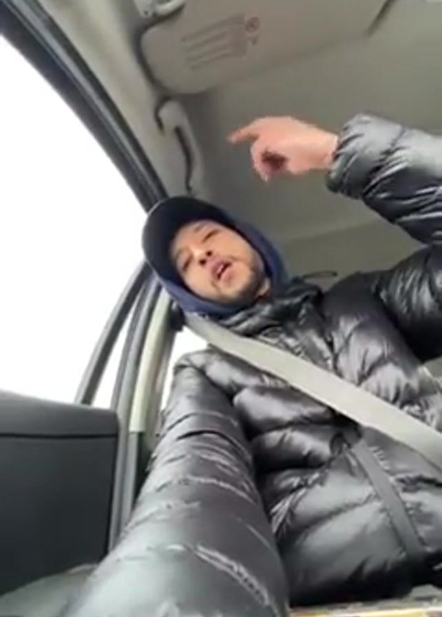 man in a car wearing a puffy black jacket, a dark baseball cap, and a light blue hoodie underneath the jacket