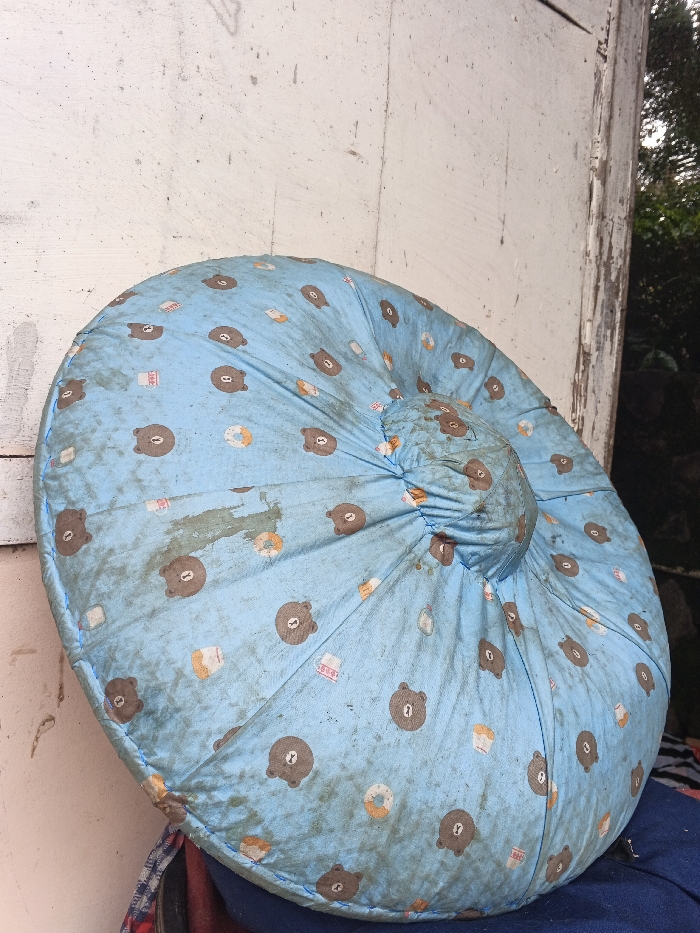 The scene is located in Pinnwe, Myanmar (Burma). A large, circular, light blue fabric cushion, soiled with dark brown and grey stains and specks, is positioned against a vertical, light-colored wooden wall. The cushion features a repeating pattern of brown bear heads, white milk cartons, and orange donuts, and has a central, gathered indentation. The wooden wall exhibits visible grain, wear, and areas of peeling paint. To the right of the wall, an obscured dark outdoor area, likely foliage, is partially visible. Beneath the cushion, fragments of other fabrics, including a striped pattern (red, blue, white) and a solid dark blue material, are present. No individuals are depicted, and no active interactions are occurring.