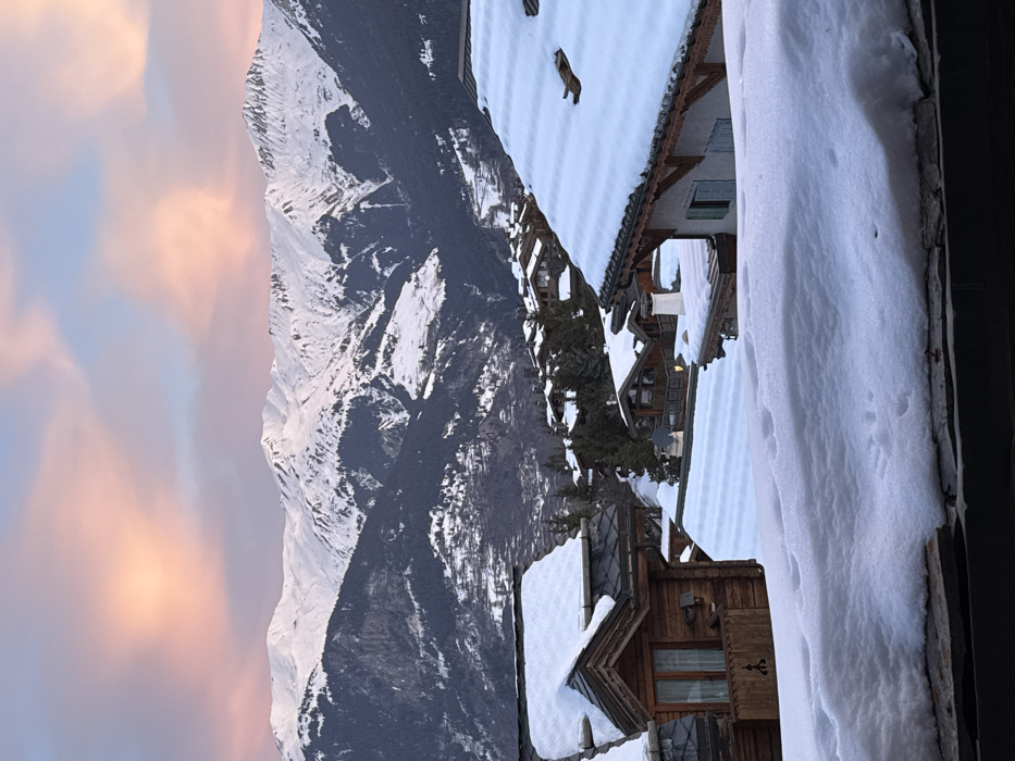 A picturesque mountain range, partially snow-capped, dominates the left side of the frame, juxtaposed with a sky tinged with pink hues. Snow-covered chalet roofs cascade down the right side, with a fox walking on one of the roofs. The scene suggests a winter landscape from an elevated viewpoint, possibly a balcony. Thick snow edges the immediate foreground, adding depth and further emphasizing the snowy environment.