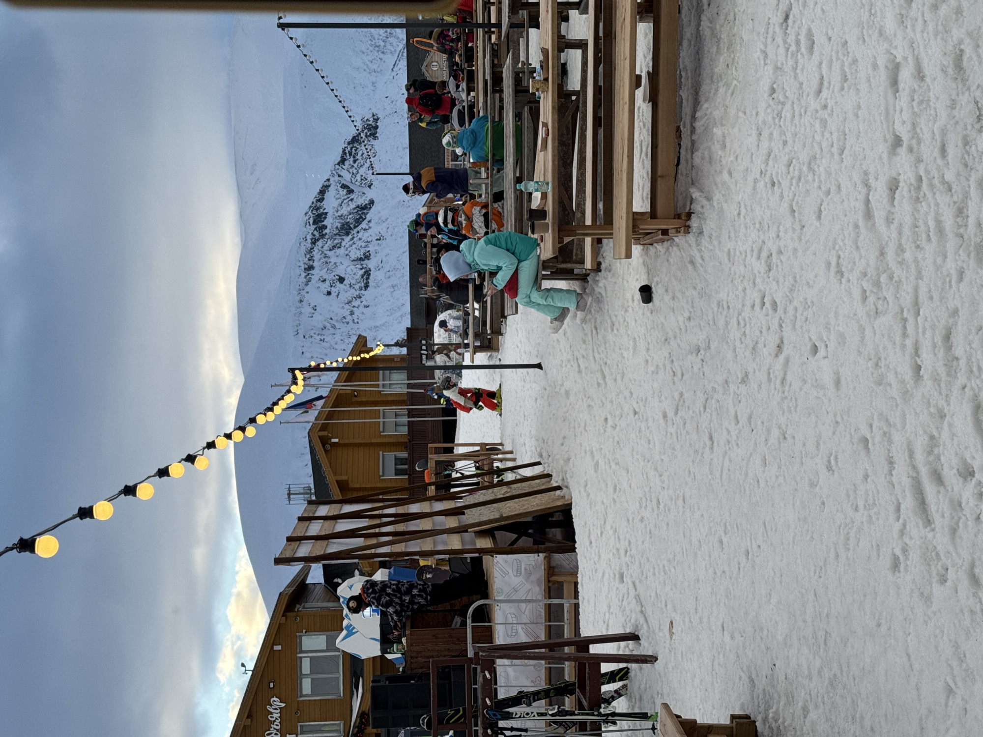 The image depicts an outdoor scene at what appears to be a ski resort restaurant in Kirovsk, Russia. There is a snow-covered ground. A mountain is visible in the background. Overhead string lights are strung across the scene. Several wooden picnic tables are positioned on the right of the frame. People are seated at the tables, some are wearing ski gear. One person in light blue ski gear is seen bending over one of the tables. In the lower portion of the image, there is a building, ski equipment (skis and poles), and a wooden structure.