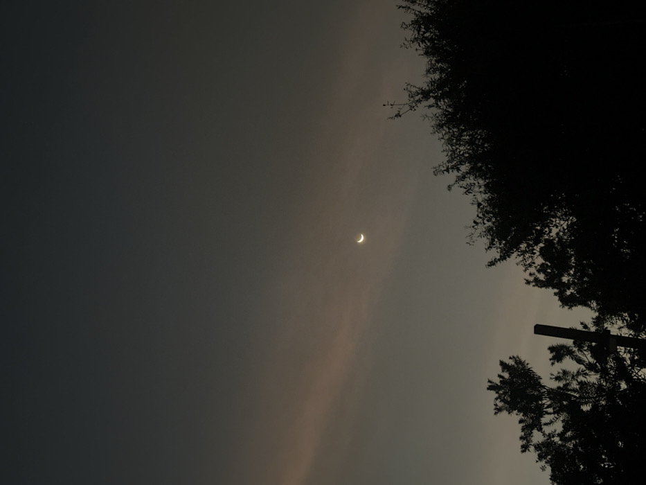The image displays an outdoor twilight or early evening scene in Tinaquillo, Venezuela. The upper three-quarters of the frame show a gradient sky, transitioning from dark grey-blue at the top to a lighter, subtly pinkish-grey hue lower down. A distinct, illuminated crescent moon is positioned in the mid-left area of the sky. The bottom quarter of the image is occupied by the dark silhouettes of dense tree foliage and branches. A dark, vertical, rectangular pole is partially visible among the trees in the lower-left section. No individuals, actions, or interactions are discernible within the scene.