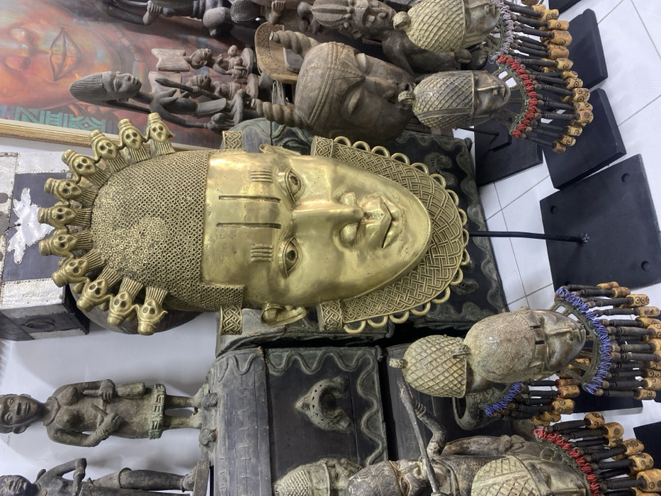The scene depicts a dense indoor display of traditional African art objects in Ikate, Nigeria