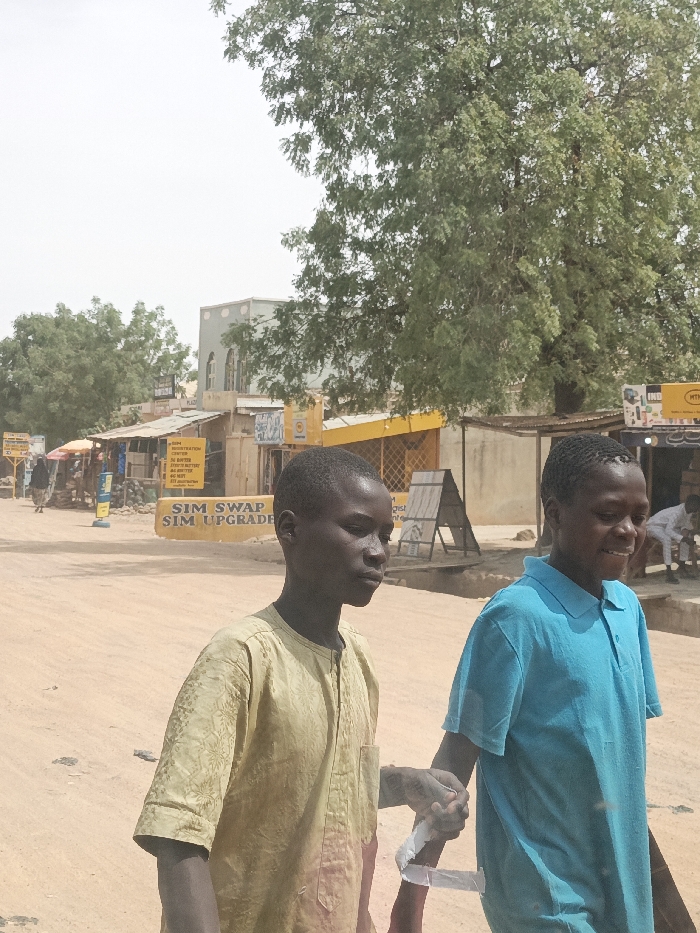 The image depicts a daytime street scene in Hotoro North, Nigeria. In the foreground, two young males walk from left to right on an unpaved, dusty road. The male on the left wears a light brown, patterned long-sleeved tunic and has a neutral expression. The male on the right wears a bright blue short-sleeved polo shirt and is smiling. Their right hands are clasped together, partially obscured by a white band-like material and a red object. The background features a row of single-story commercial structures and one taller building with a light grey-blue facade and arched windows. Storefronts exhibit various signs, including a prominent yellow sign advertising "SIM SWAP SIM UPGRADE" and other services like "SMILE REGISTRATION" and "MTN." A large, leafy green tree occupies the upper right portion of the frame, with other trees visible further in the background. Scattered individuals are present in the background, including one person walking left and another seated outside a shop. The ground is consistently unpaved and dusty, consistent with a semi-urban environment.
