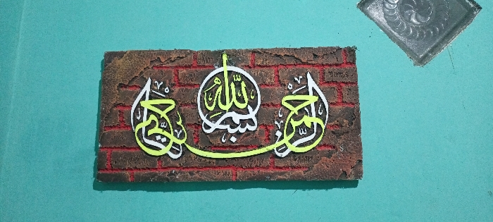 A rectangular piece of Islamic calligraphic artwork is displayed against a flat, teal-colored wall in Mns Alue, Indonesia