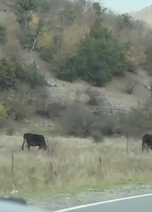 - "From inside a moving car, a cow grazes in a field beside a road with hilly terrain in the background" by FM-3ImFi1, licensed under CC BY 4.0