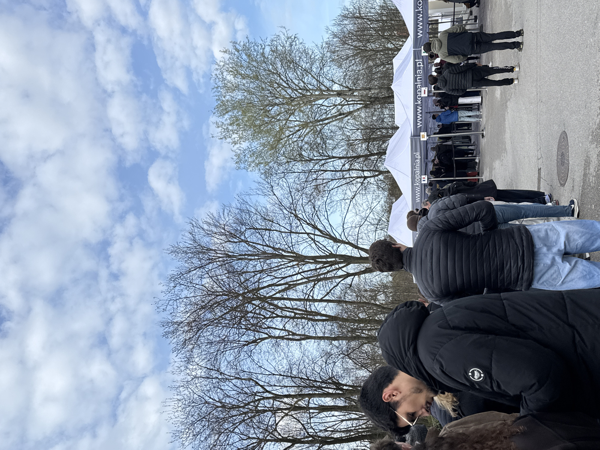 group of people standing in line outdoors in Wieliczka, Poland, likely waiting for entry to an event. They are standing near a row of white tents with the website address "www.kopalnia.pl" printed on them. The sky is visible with scattered white clouds. Bare tree branches fill the mid-ground, adding to the outdoor setting. The focus is on the people in the foreground, some wearing jackets, suggesting a cool or cold day. The ground appears to be paved.