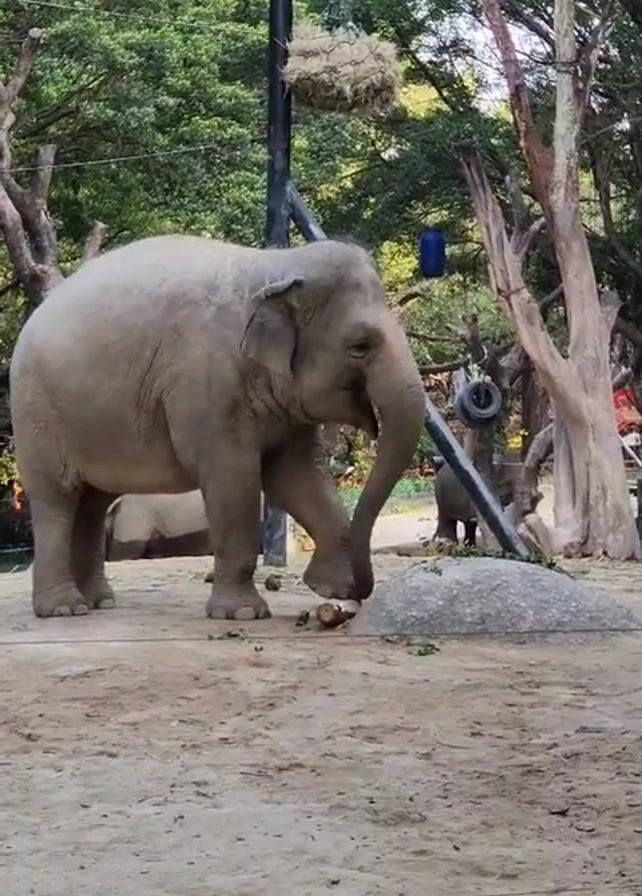 gray Asian elephant standing on a dirt surface in what appears to be a zoo or sanctuary. The elephant is the main subject of the video. Behind it are green trees and some white-barked trees. There's also a black pole supporting a basket of hay. In the background, another smaller elephant can be seen. The first elephant appears to be picking up or interacting with a small object on the ground using its trunk. The overall setting seems to be a natural, outdoor environment designed for the elephants.