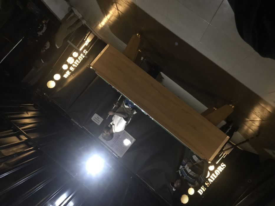 A tilted view depicts the interior of a "De Sailors" establishment. A long, wooden table dominates the scene, its surface reflecting the surrounding environment. A person wearing a white shirt appears to be consulting a menu or information sheet. The overall lighting is dim, except for bright spotlights and overhead lights near the bar area. The scene includes the person, table, and the surrounding interior of the establishment.
