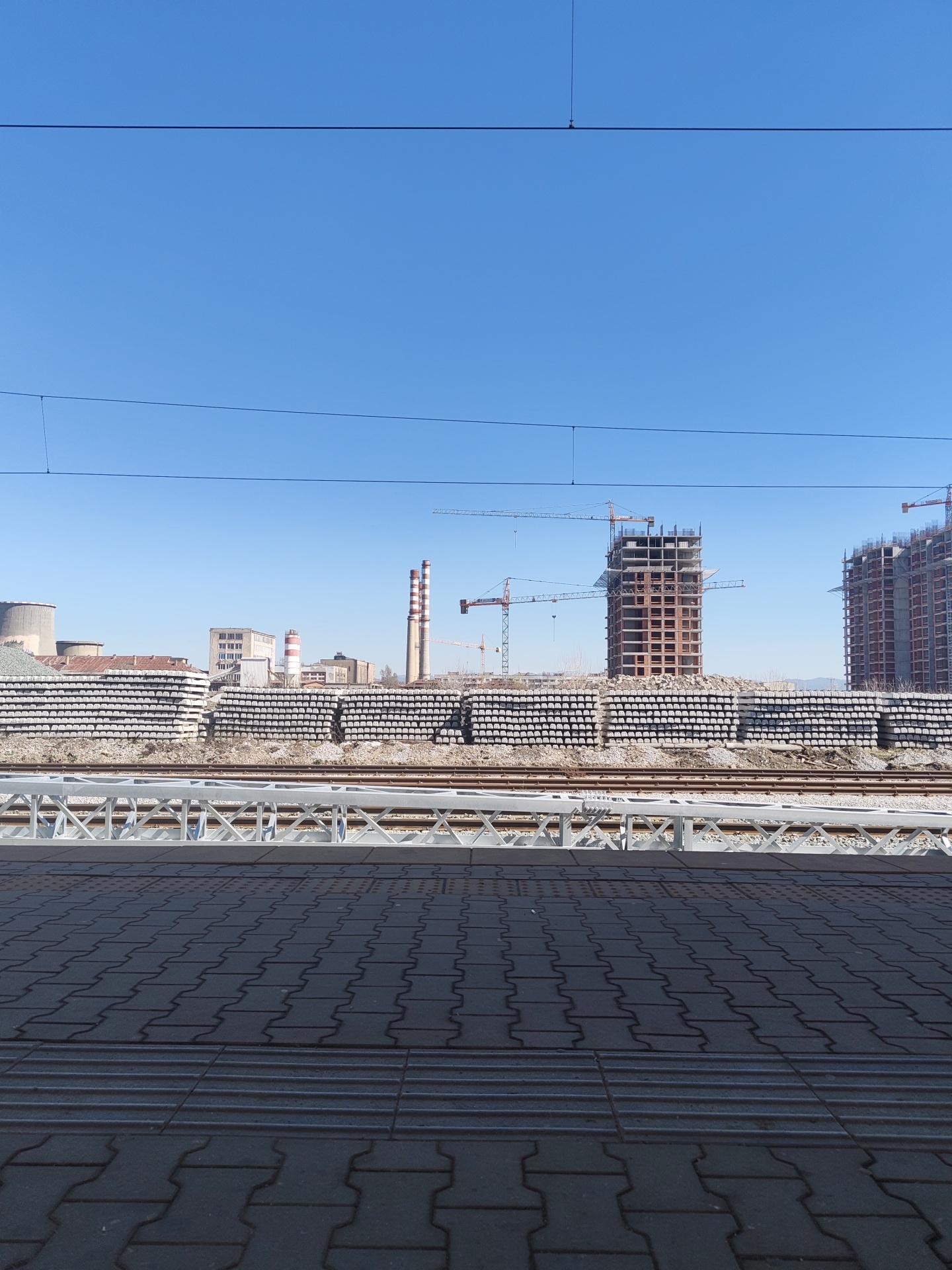The image captures a scene at a railway station platform in Sofia, Bulgaria. The foreground features a paved platform with a tactile paving section, designed for visually impaired individuals. Beyond the platform, railway tracks are visible, with stacks of concrete sleepers stored alongside. In the background, an industrial area is situated, featuring a power plant with chimneys, as well as the skeletal frames of several high-rise buildings under construction, complete with cranes. Overhead, power lines stretch across a clear blue sky. No people are visible in the image.